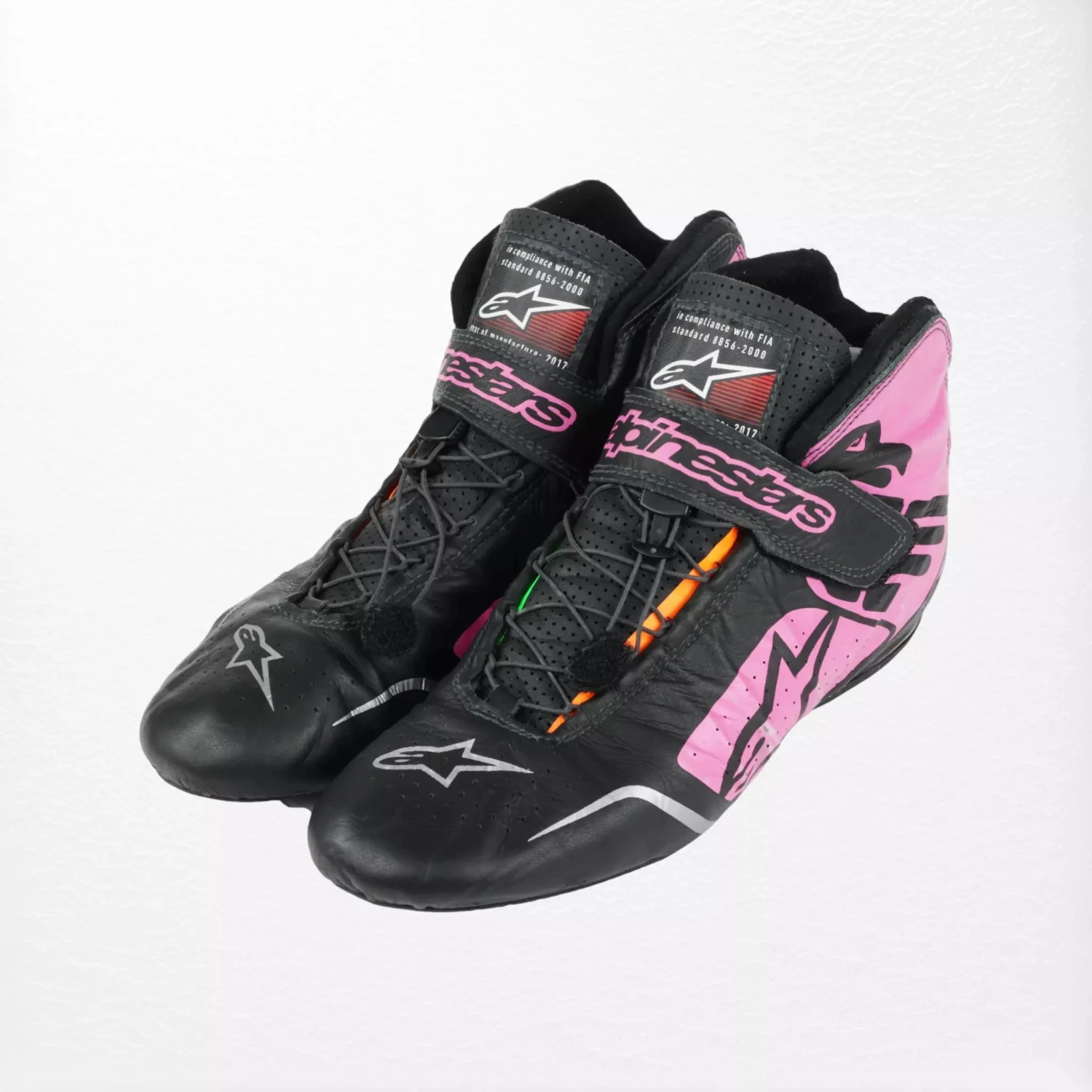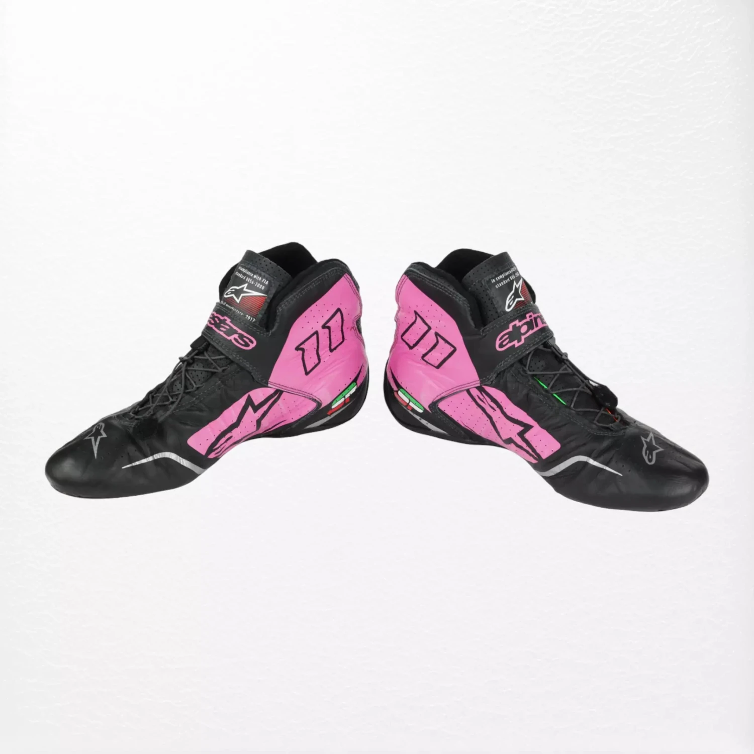Alpinestars racing boots worn by Sergio ‘Checo’ Perez during the 2017 Formula 1 season while driving for the Sahara Force India team