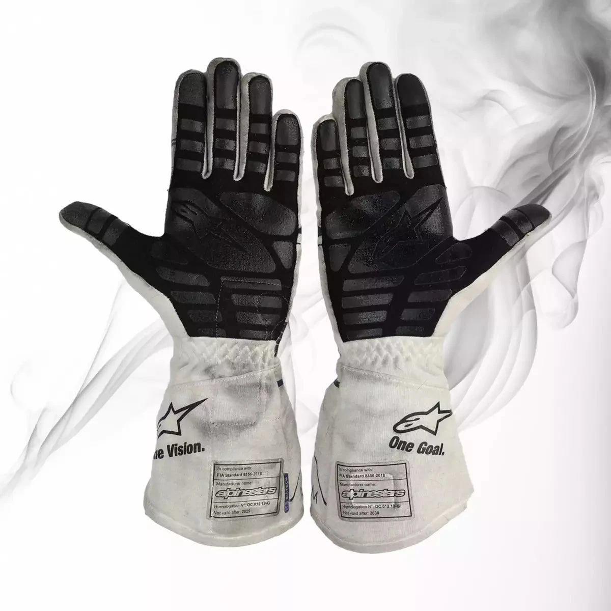 Alpinestars race gloves worn by young French Formula 1 rising star Pierre Gasly during the first two races of the 2020 Formula 1 season. Gasly would pilot Red Bull Racing’s second team, the newly named and liveried Scuderia AlphaTauri (formerly Scuderia Toro Rosso) Honda-powered AT01 machine.