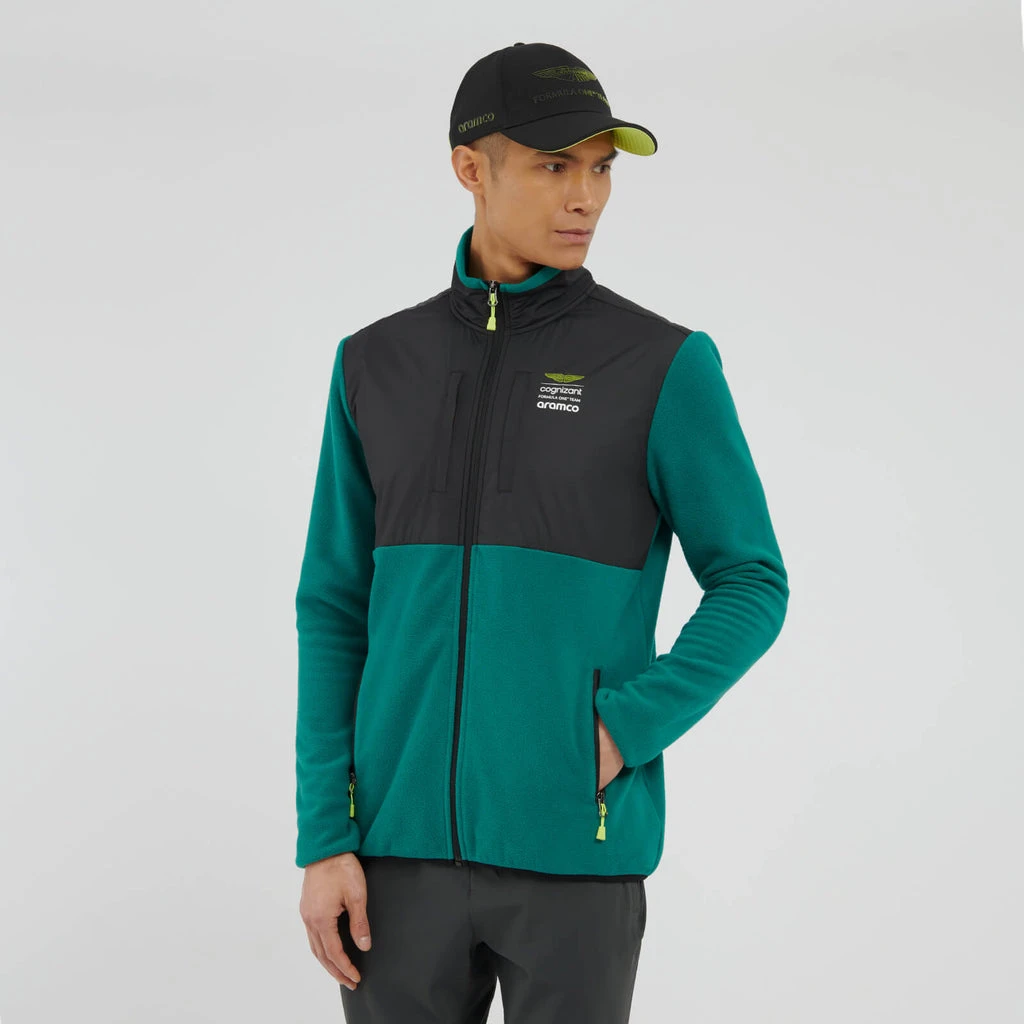 The 2023 Official AMF1 Lifestyle Track Jacket – as worn by drivers Fernando Alonso and Lance Stroll – Level up your layers with the AMF1 Official Lifestyle Track Jacket. In a green colourway with contrasting black windproof shell fabric, this standard-fit fleece is made from 100% polyester. It features a zip pockets, a full length zip opening and our iconic Aston Martin wings logo to the rear. You can wear this as an easy, go-to essential.