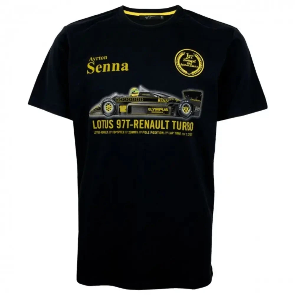 The Ayrton Senna T-shirt is dedicated to the Lotus 97T and its first victory in 1985. In Estoril / Portugal Senna could win a Grand Prix for the first time in his Formula 1 career. The large print shows the Lotus 97T on the front. On the chest there is an embroidered batch with the inscription “1st, Portugal, 1985, Ayrton Senna”.