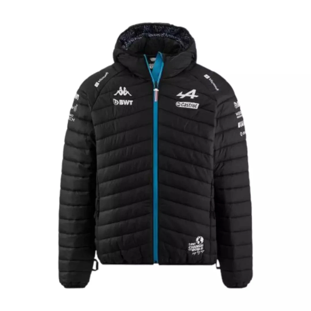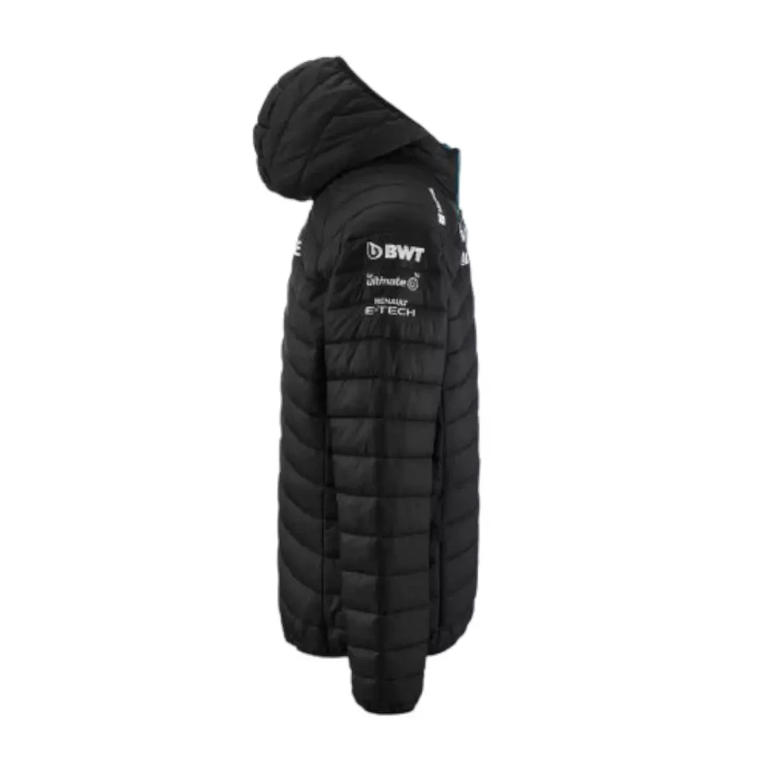 The 6CENTO 660 down jacket made in BWT ALPINE F1® Team is a black padded hooded down jacket with a zipped opening on the front. This technical down jacket has been specially designed to be waterproof and weatherproof. Padded in polyester, this jacket has a slim fit and is a clear sign of support for the BWT ALPINE F1® Team. However, it can also be worn in all everyday situations. As one of the most accomplished pieces in the collection, this down jacket perfectly combines comfort and technicality.