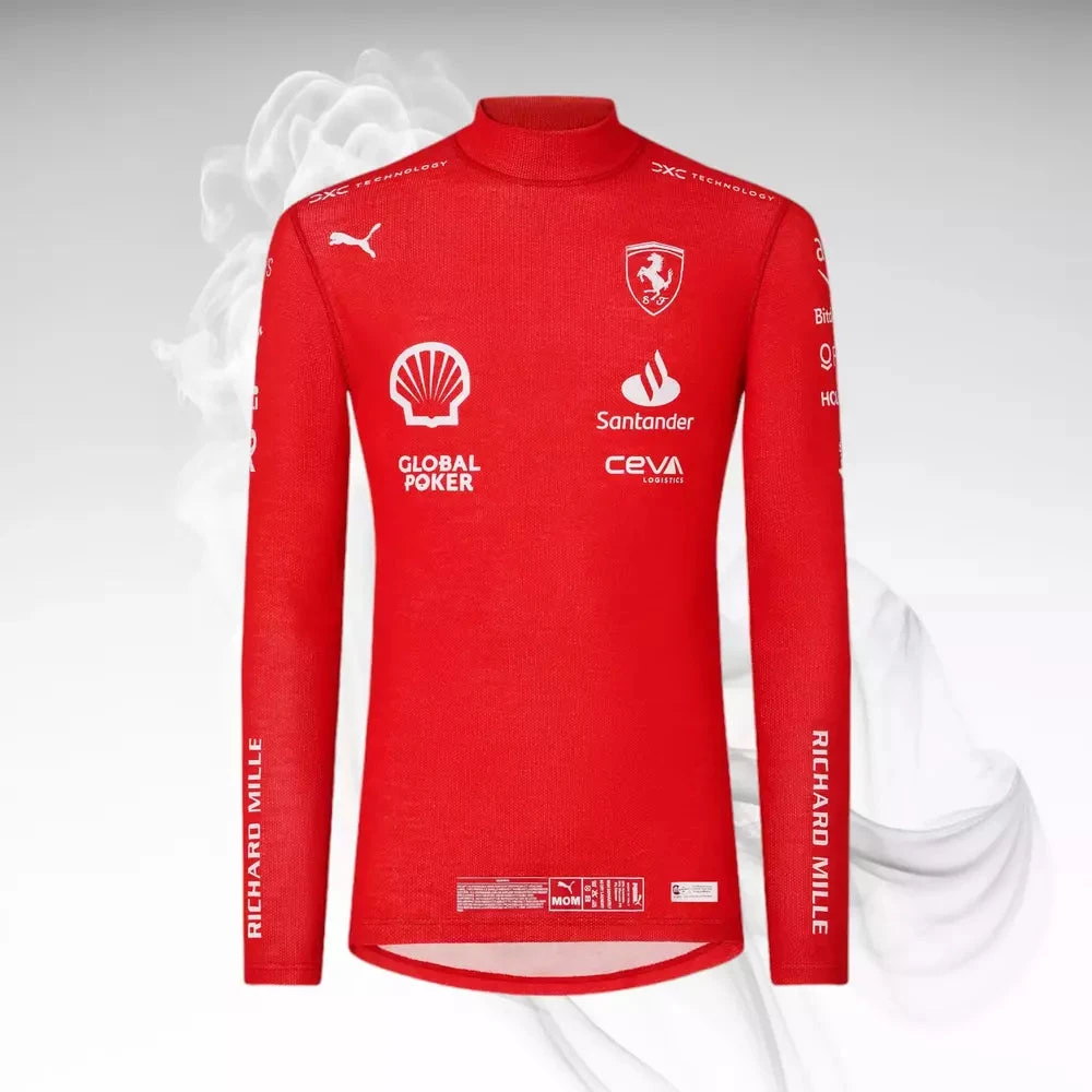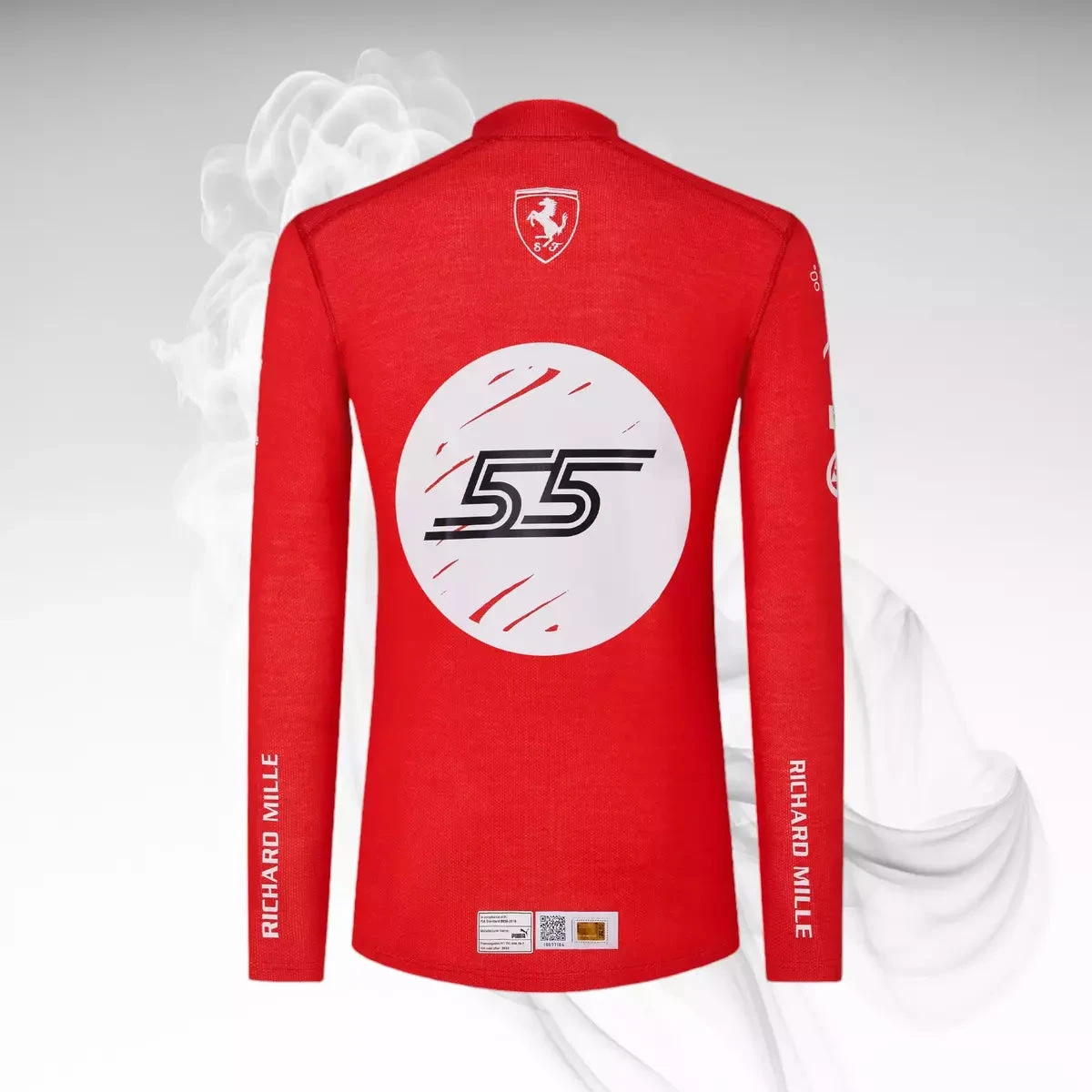 The exclusive undersuit top worn by Carlos Sainz in the 2023 Las Vegas Grand Prix, back after an absence of over forty years, pays tribute to the Golden Era of F1 in the United States. Distinguished by its brand-new look, the garment’s design is inspired by the aesthetics of iconic Ferrari car liveries from the 1970s.